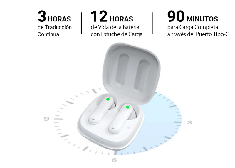 *Las pruebas realizadas en los laboratorios de Timekettle son solo referenciales; la duración de la batería puede variar según la configuración, el entorno, el uso y otros factores.